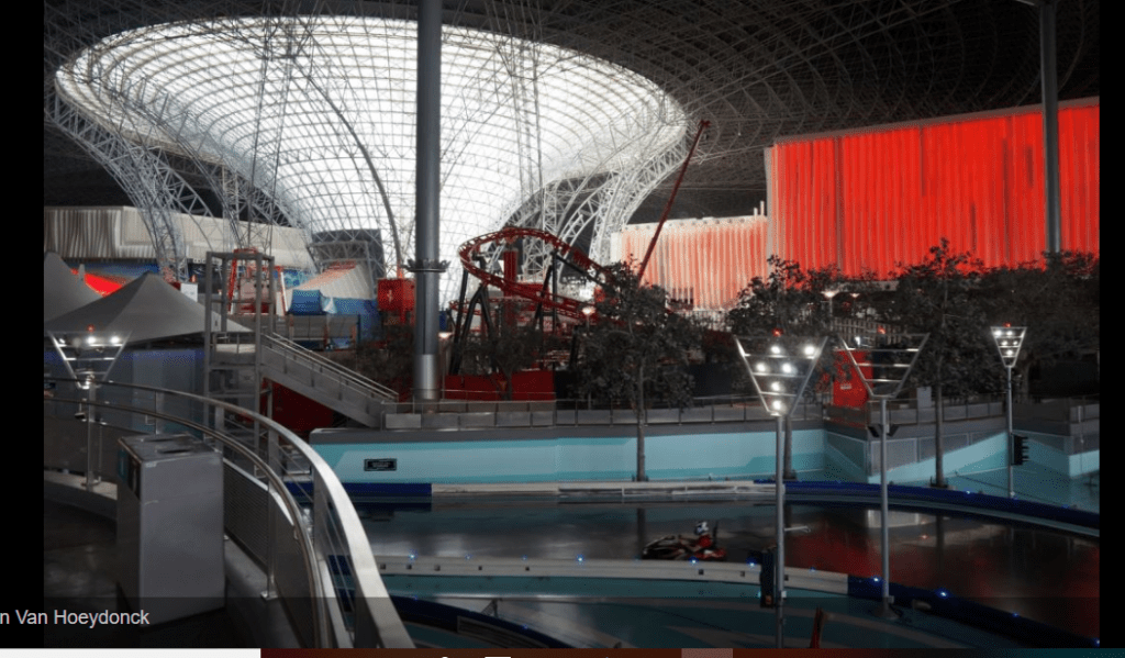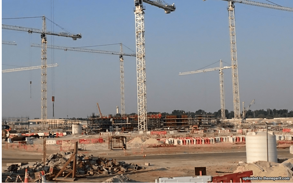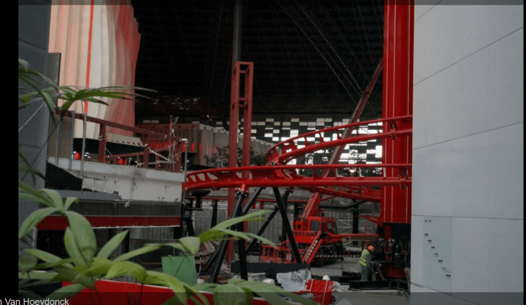 In this photo you can see that all of the track inside the showbuilding is complete and that the building is quickly rising around the track. In the foreground you can see tons of supports and launch track for the beginning of the ride.